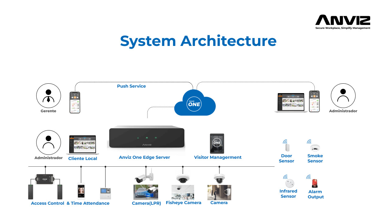 Anviz One is a comprehensive security system with a hybrid cloud architecture, consisting of locally deployed Anviz One Edge Server, access control devices, video surveillance devices, alarm devices, attendance devices, visitor management hardware devices, etc., enabling remote management and access through the cloud.